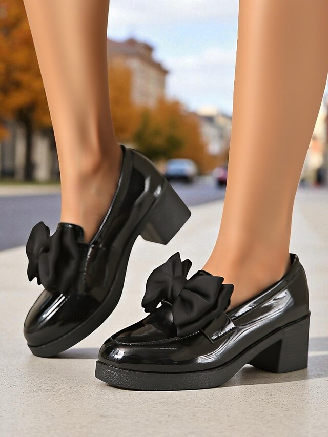 Women's Patent Faux Leather Chunky Heel Loafers with Oversized Bow – Retro Style Dress Shoes for Outdoor Casual Activities and Daily Streetwear 1