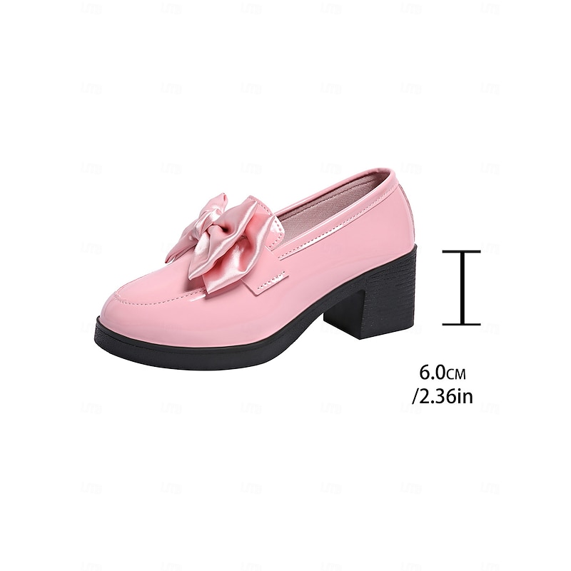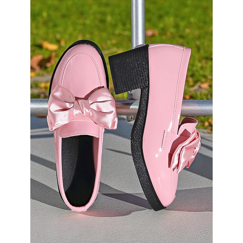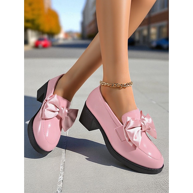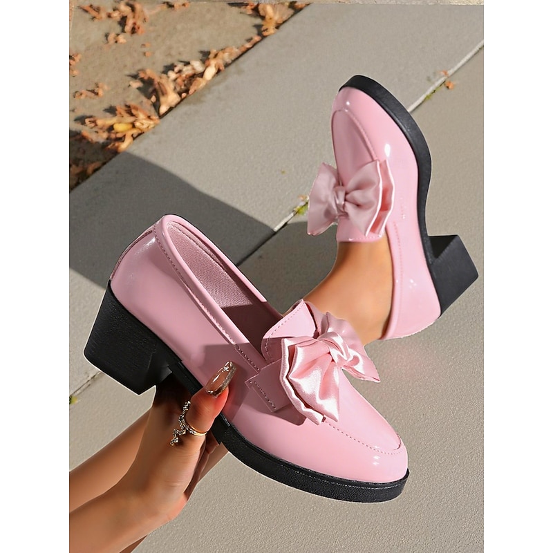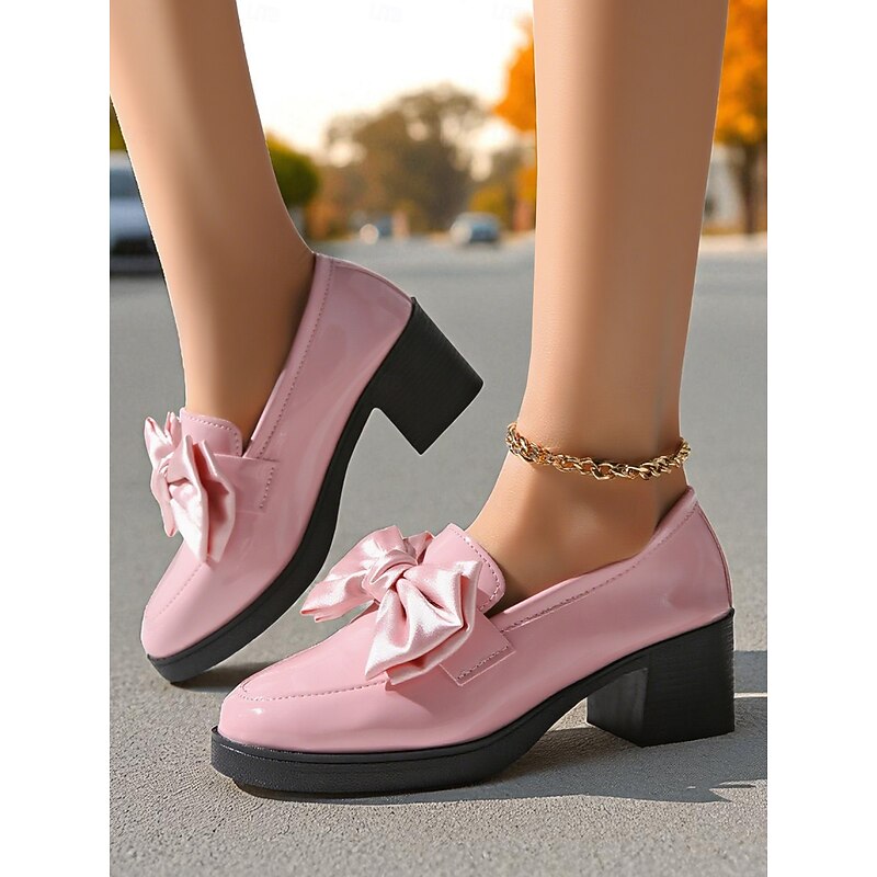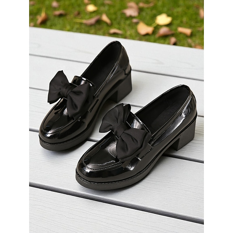 HOT ! Women's Patent Faux Leather Chunky Heel Loafers with Oversized Bow – Retro Style Dress Shoes for Outdoor Casual Activities and Daily Streetwear