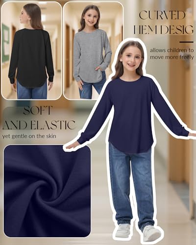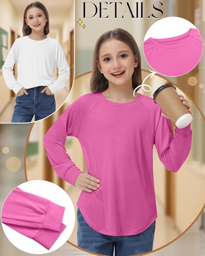 5 Pack Girls' Long Sleeve Shirts Curve Hem Crewneck Tops Raglan Loose Fit Casual Kids Basic Tees Fall 2