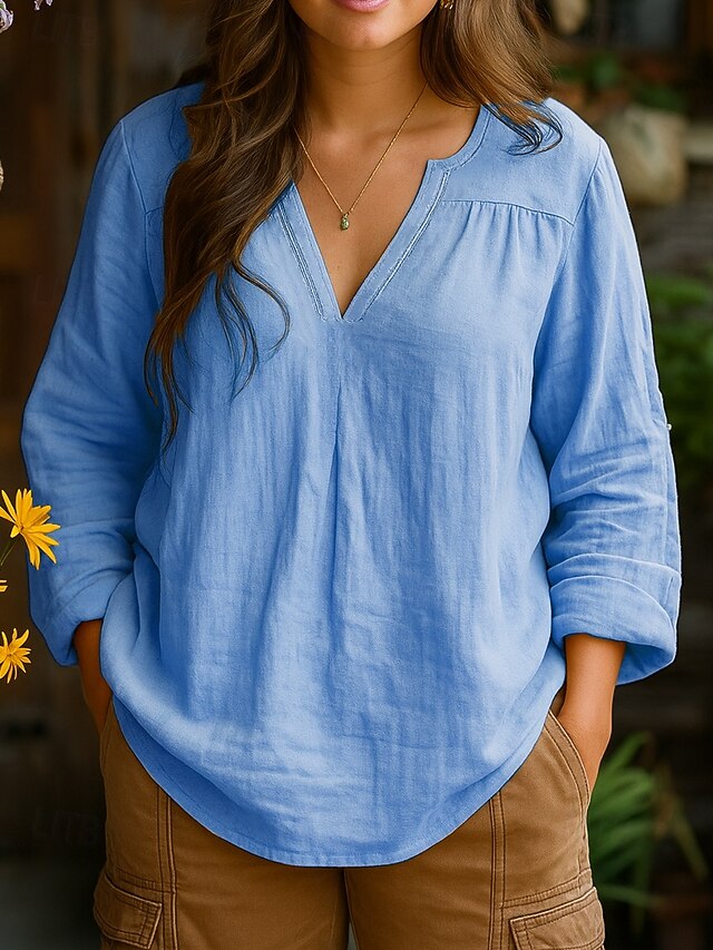 Highlights - Perfect for both Spring and Fall seasons - Made of high-quality linen fabric - Features stylish ruched design - Long sleeves for added warmth - Flattering V-neckline - Ideal for women's work attire or professional occasions.