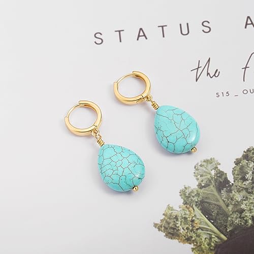 • Material: The fashion gold hoop earrings are made from high-quality 18K gold plating, radiating luxury and durability. The teardrop turquoise gemstone, carefully selected for its vibrant hue and natural beauty, creates a harmonious blend of materials that turquoise earrings catches the light from every angle, emphasizing its unique birthstone significance.