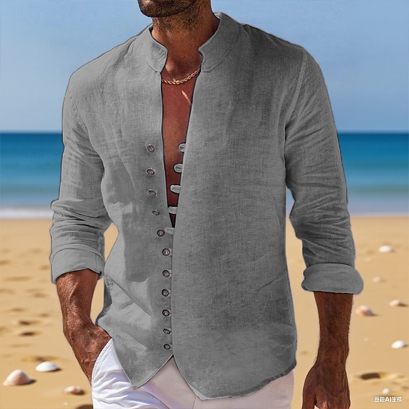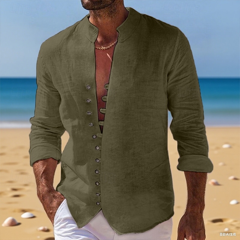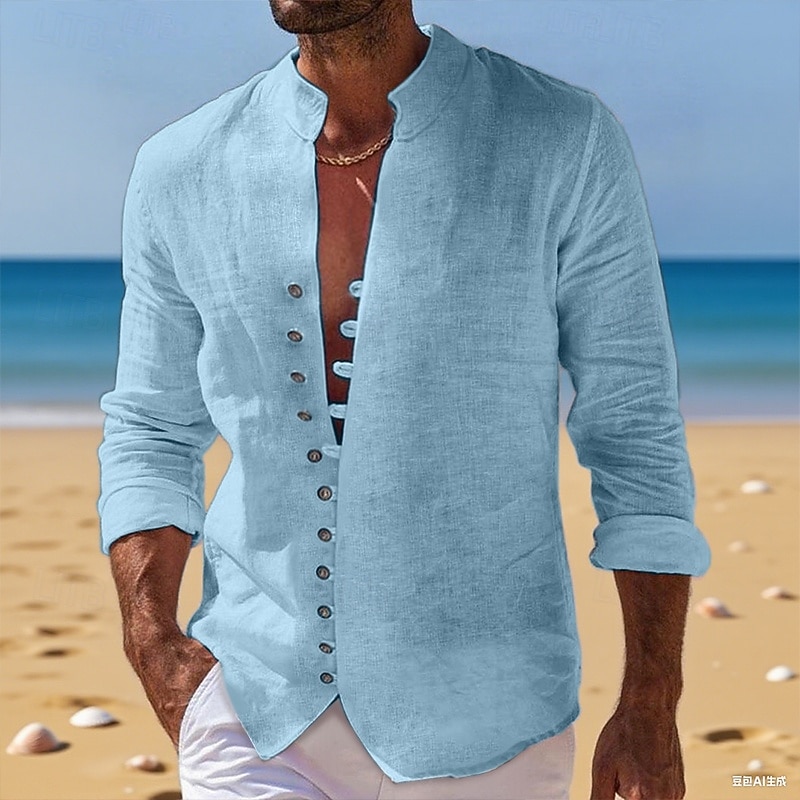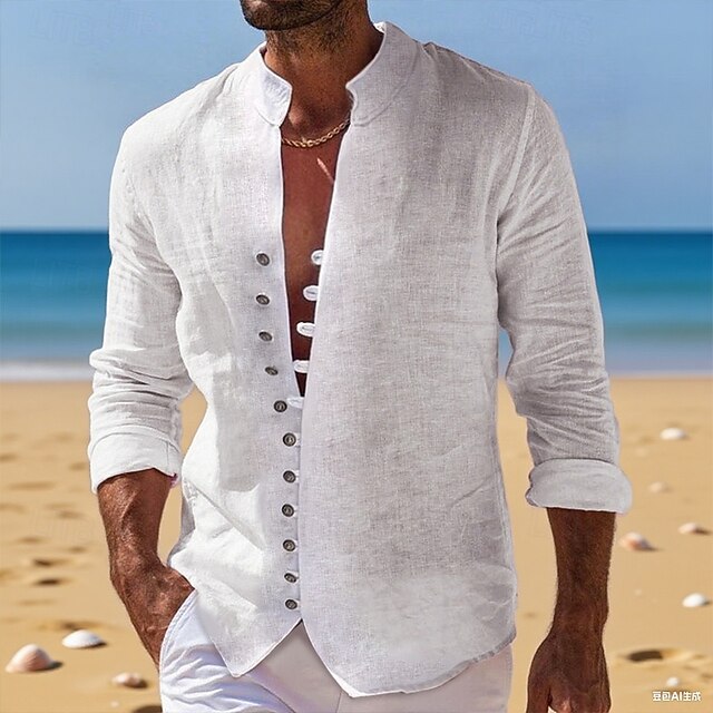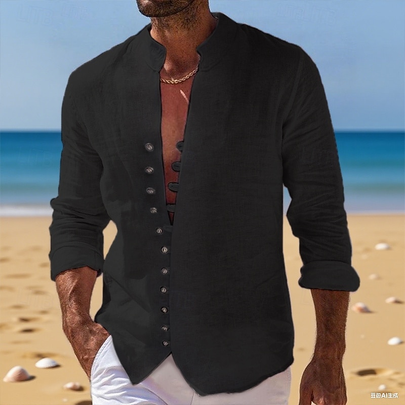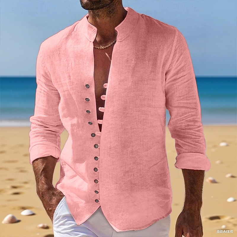 More information about Men's Shirt Linen Shirt Summer Shirt Casual Shirt Button Up Shirt Plain Vacation Curise Black White Pink Blue Long Sleeve Band Collar Summer Spring & Fall Clothing Apparel