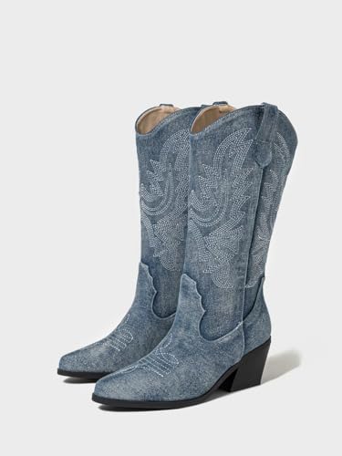Women's Rhinestone Cowboy Boots Pull On Pointed Toe Chunky Low Heel Denim Western Mid Calf Cowgirl Boots