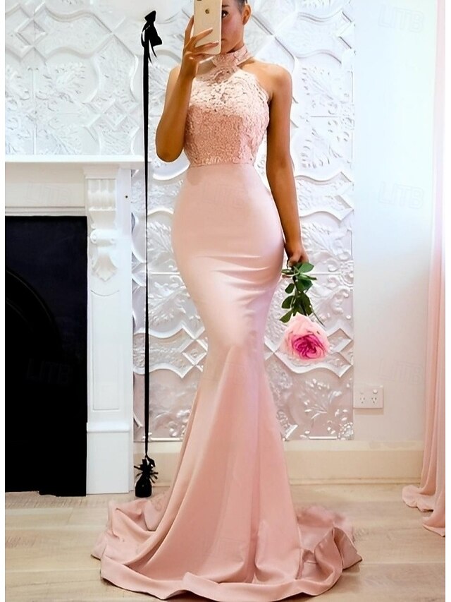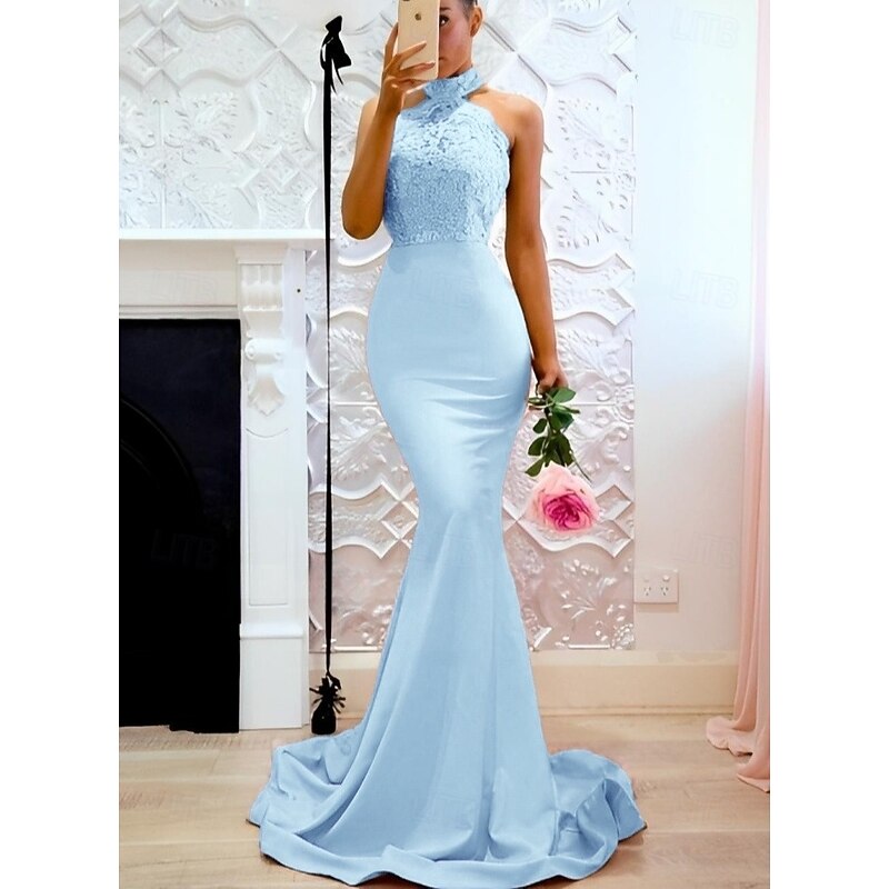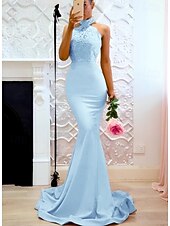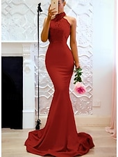 More information about Mermaid / Trumpet Evening Gown Elegant Dress Formal Evening Party Court Train Sleeveless Halter Neck Satin with Buttons Slit