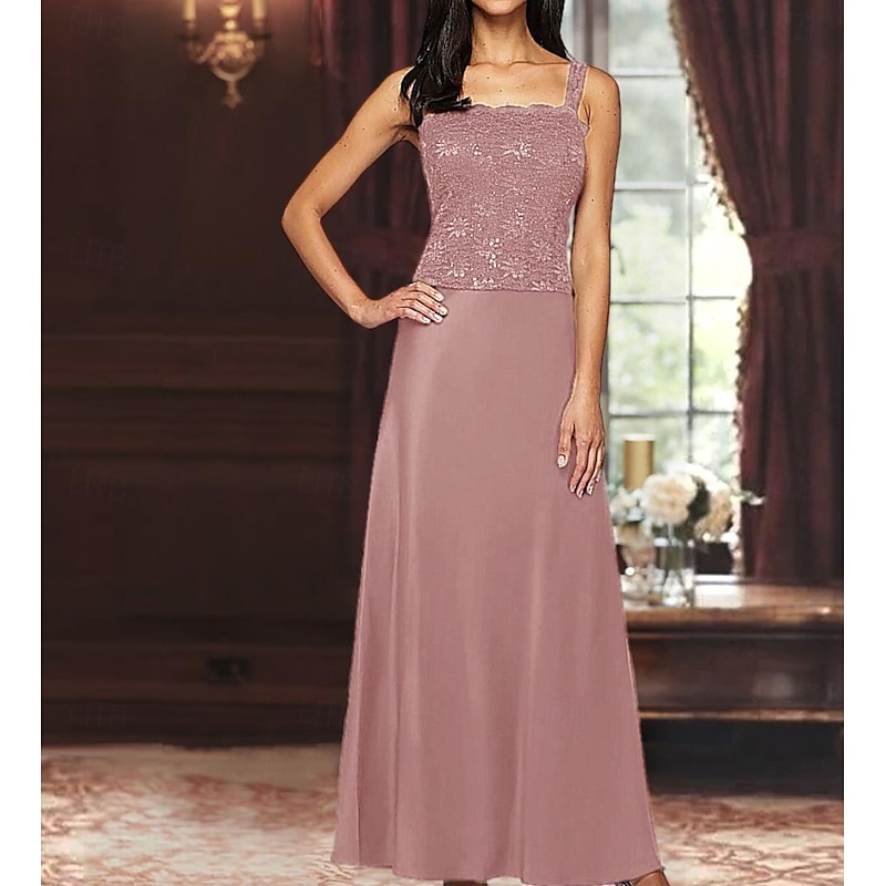 A-Line 3 Piece Mother of the Bride Dress Formal Wedding Guest Elegant Simple Luxurious Square Neck Floor Length Satin Lace 3/4 Length Sleeve with Lace Sequin 11