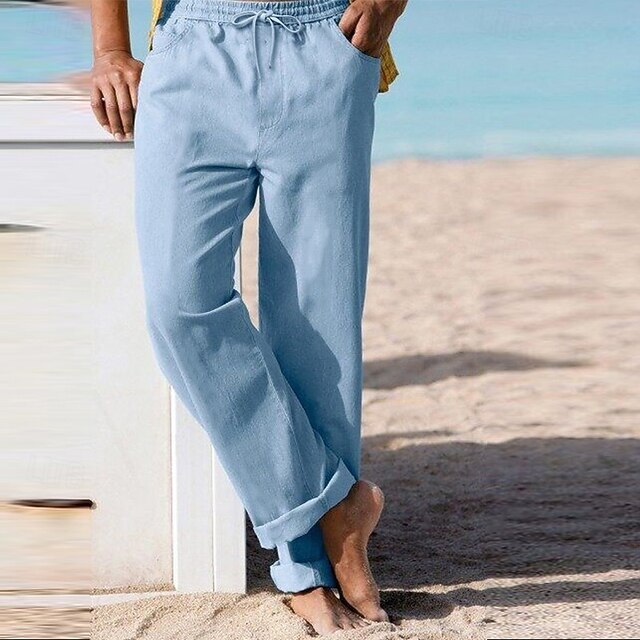 HOT ! Men's Linen Pants Trousers Summer Pants Beach Pants Drawstring Elastic Waist Straight Leg Plain Comfort Breathable Full Length Casual Daily Holiday Vacation Fashion White Sky Blue