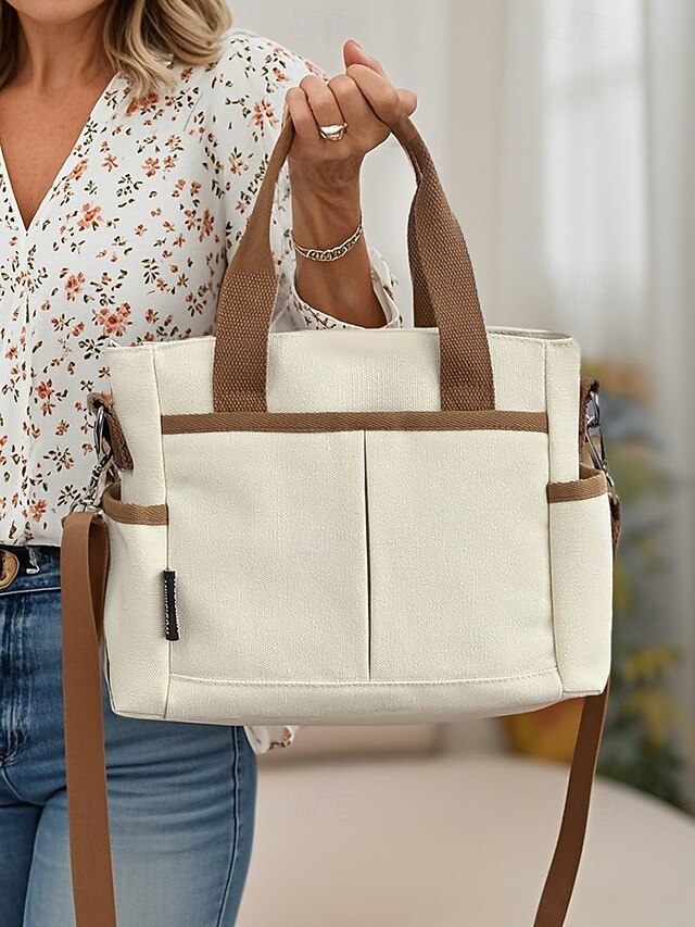 HOT ! Women's Canvas Tote Shoulder Bag – Casual Two-Tone Handbag with Large Capacity, Multi-Pocket Design, Lightweight Crossbody Purse for Daily Use, Travel & Mom Essentials