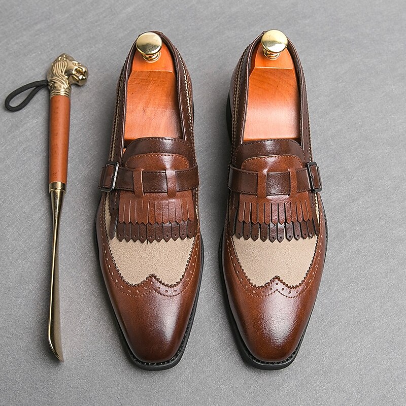 Highlights [Product Highlights] [Material] : Expertly crafted from premium PU leather, these Men's Retro Faux Leather Loafers exude elegance and durability. The smooth upper surface provides a polished look, enhancing the sophistication of the navy and beige color scheme. [Style] : The classic brogue design merges traditional and contemporary styles, offering a versatile and stylish footwear option. The meticulously crafted fringe and sleek buckle details contribute to a modern yet timeless aesthetic. [Design Highlights] : Featuring a round toe shape and a sophisticated loafer closure, these shoes are adorned with decorative tassels that elevate the classic brogue design. This unique combination gives the loafers a distinctive edge, perfect for fashion-forward individuals. [Occasions] : These shoes are ideal for a variety of occasions—be it formal engagements, smart-casual outings, or everyday wear. Their comfortable interior and slip-resistant rubber outsole make them suitable for long-lasting wear, ensuring style without compromising on comfort. [Size Range] : Available in a diverse range of sizes, from US7 to US11, this collection caters to different preferences, ensuring a perfect fit for every discerning gentleman.