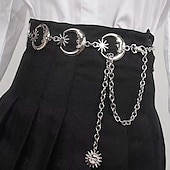 Highlights [Fabric] : Crafted from high-quality metal, this chain belt offers a sleek silver finish with a highly polished look. The use of metal ensures durability and a sophisticated shine that enhances its modern aesthetic. [Design Highlights] : This unique chain belt showcases a celestial theme featuring crescent and star motifs, linked together to form a striking, standout structure. The design is further enriched by dangling chain links that add movement and a dynamic edge, making it not just a belt, but a statement accessory. [Occasions] : Perfect for parties, daily outings, and even work settings, this belt adds a touch of classic, casual style to any ensemble. Whether dressing up for a special event or adding flair to everyday wear, this belt suits a variety of occasions and fashion-forward individuals. [Style] : The belt appeals with its classic, casual, and vintage retro vibe, fitting seamlessly into a range of wardrobe styles. It pairs well with skirts and high-waisted pants, optimizing the ensemble’s visual appeal with its edgy and modern design. [Size Notice] : Available in a versatile one-size format, this belt is designed to complement both men’s and women’s fashion, offering a comfortable and adjustable fit for most body types.