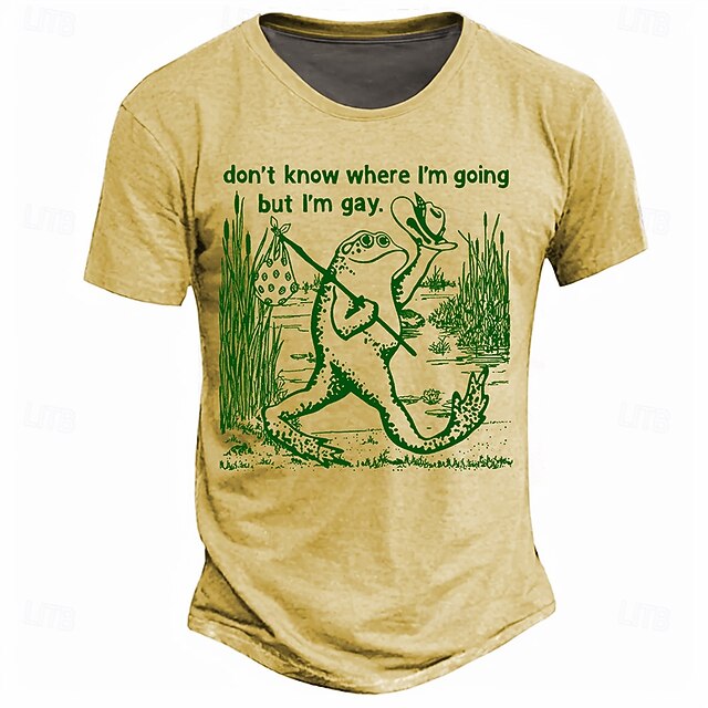 Highlights [Fabric] Crafted from a high-quality polyester blend, this T-shirt promises a stretchy and comfortable fit, ideal for the warmer months of spring and summer. The breathable material is easy to maintain with machine washability, ensuring convenience without compromising on comfort. [Fit] Featuring a tailored fit, the T-shirt provides a flattering silhouette that complements various body types. The classic crew neck and short sleeves offer a timeless and versatile design suitable for a range of casual looks. [Design Highlights] The standout feature of this T-shirt is its humorous and eye-catching 3D print, showcasing a quirky graphic of a frog alongside a playful slogan. The vibrant colors in gray, yellow, and light blue contrast beautifully with the earthy undertones, emphasizing the retro vintage style. [Occasions] Perfect for casual outings, streetwear, or bar hangouts, this T-shirt adds a touch of personality and humor to any ensemble. It's ideal for those looking to express individuality and a fun sense of style in relaxed settings. [Size Range] Available in a wide range of sizes from S to 3XL, this T-shirt accommodates diverse sizing needs, ensuring that everyone can enjoy its playful design and comfortable fit.