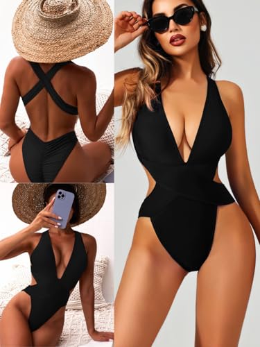 Sexy One Piece Swimsuit,Plunge Backless Color Block Swimsuits for Women,High Cut Scrunch Butt Monokini Beach Pool 5