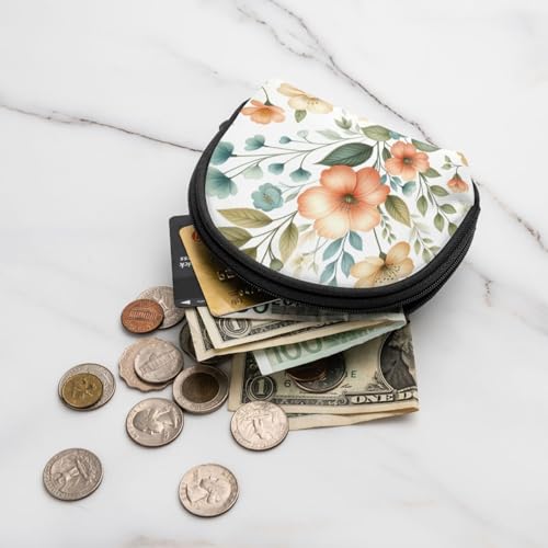 Portable Coin Purse Peach-Floral-Blossoms Mini Zippered Money Pouch Card Holder 1