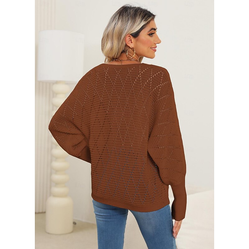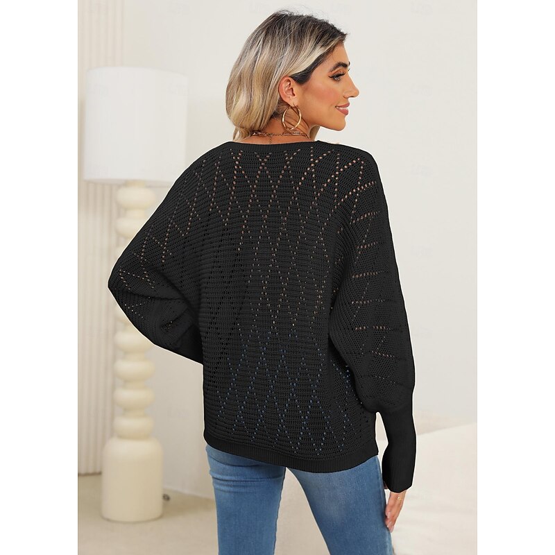 : The intricate open-knit pattern combined with a flattering V-neckline and delicate lace trim adds a touch of elegance and femininity to the sweater. Its solid color makes it a versatile piece, easily paired with various outfits for a chic look.