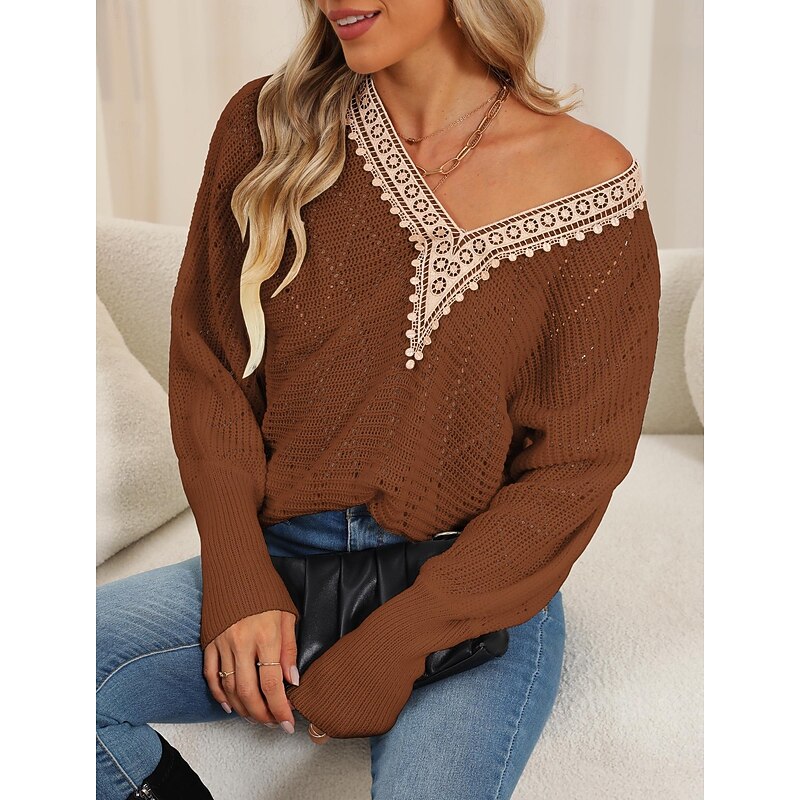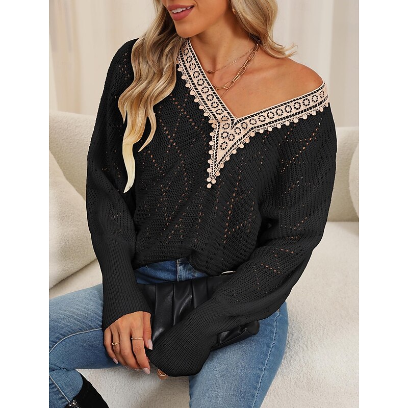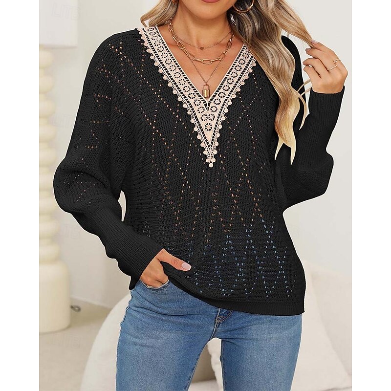 More information about Women's Sweater Elegant Daily Solid Color V Neck Lace Patchwork Long Sleeve Regular Tops Knit Home Work Black White Fall Winter
