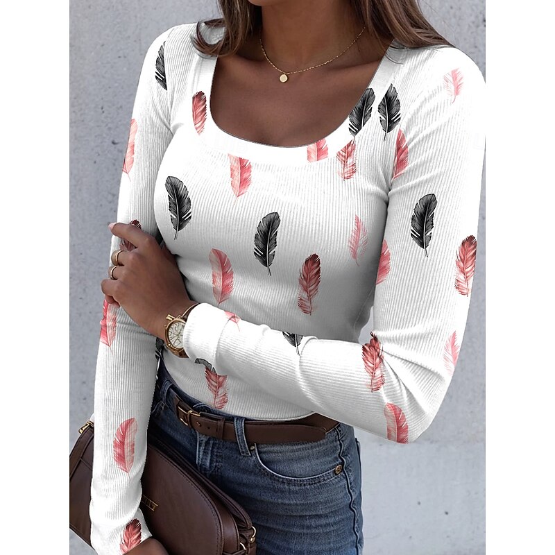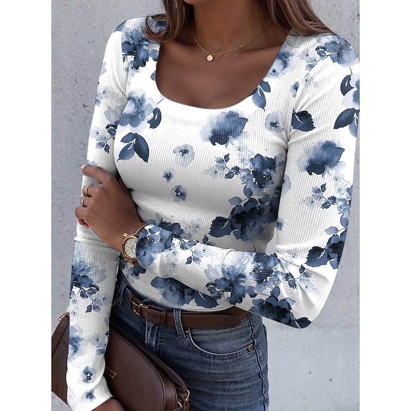 Women's T shirt Long Sleeve Ribbed Graphic Square Neck Long Sleeve Casual Floral Classic Regular Tops Daily Print Light Green Pink Red Blue Dusty Blue Spring Fall Prefall 16