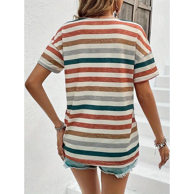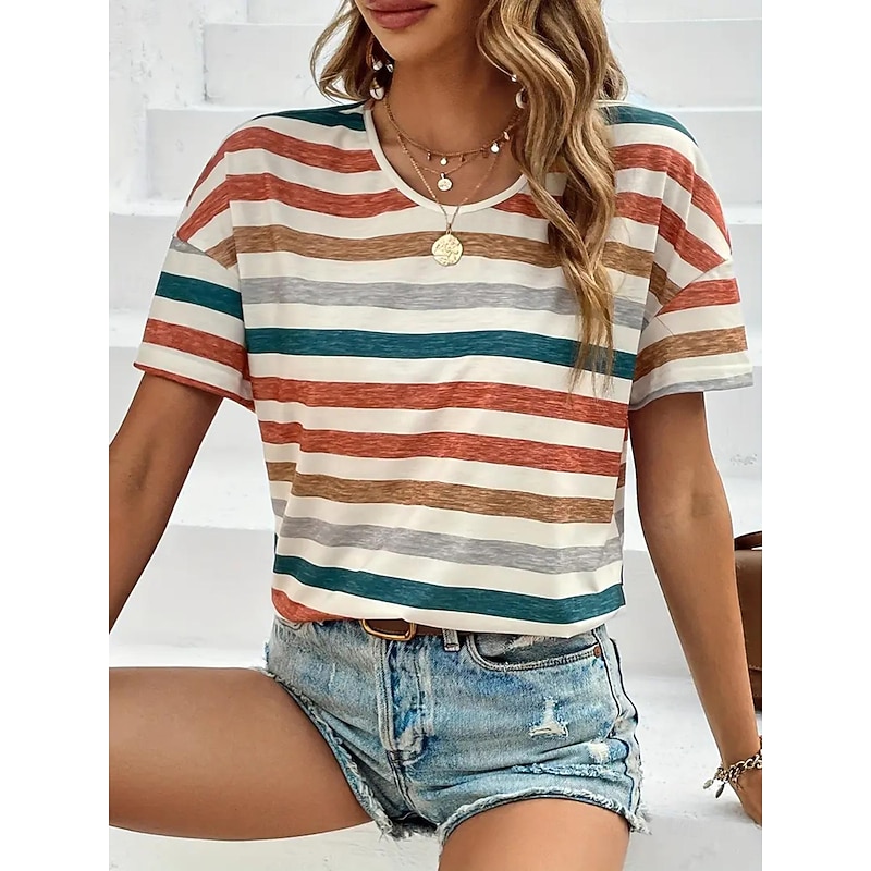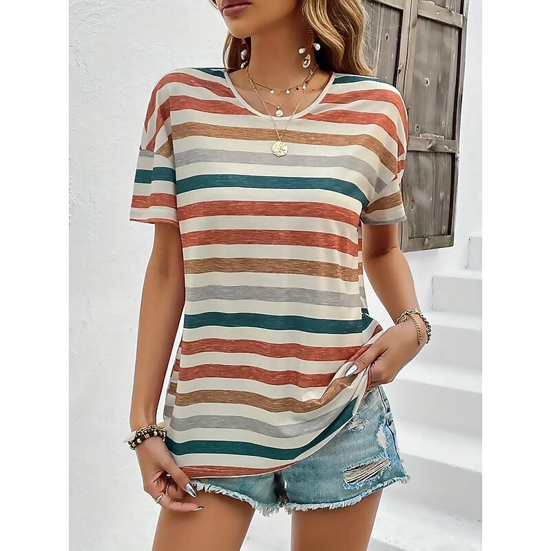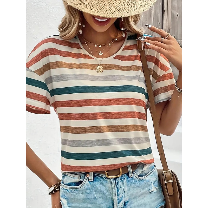 Women's T Shirt Striped Fashion Short Sleeve Round Neck Regular Tops Daily Weekend Print Orange Green Summer 9