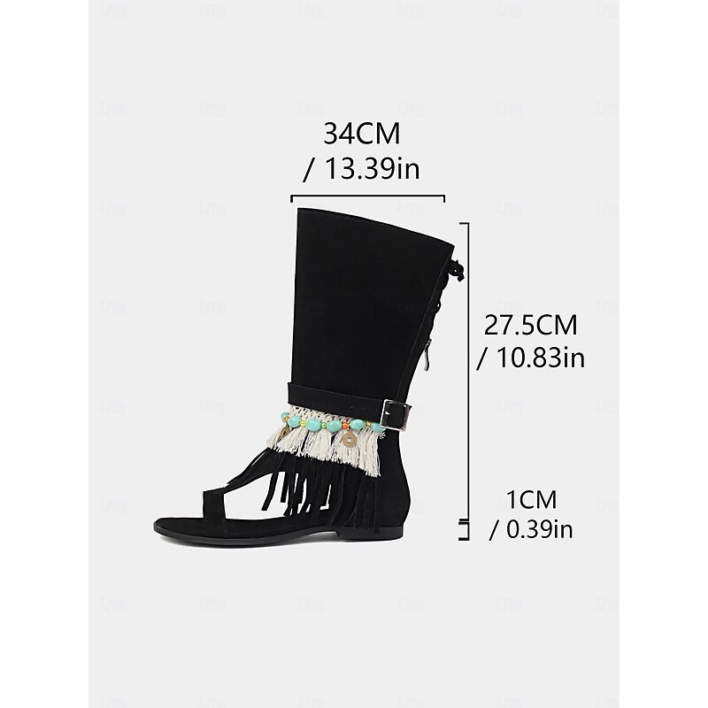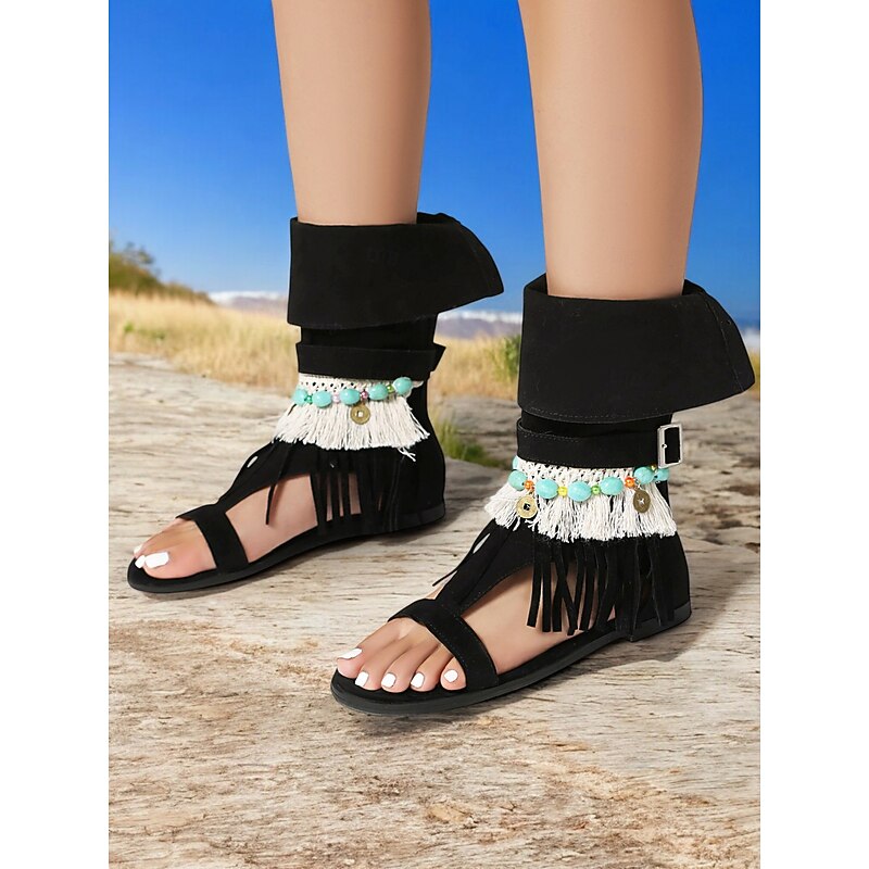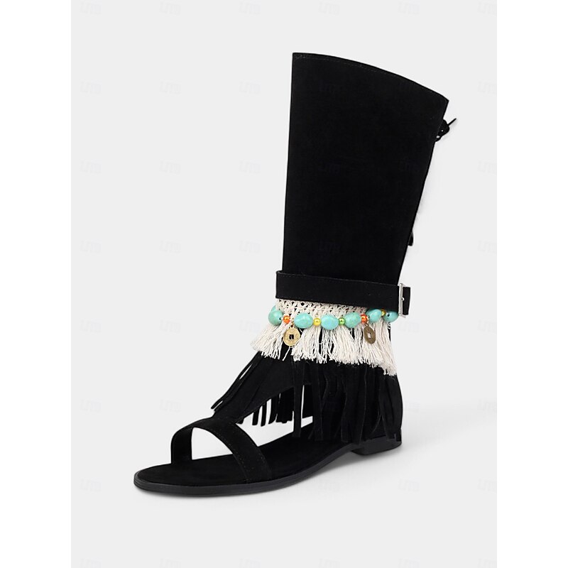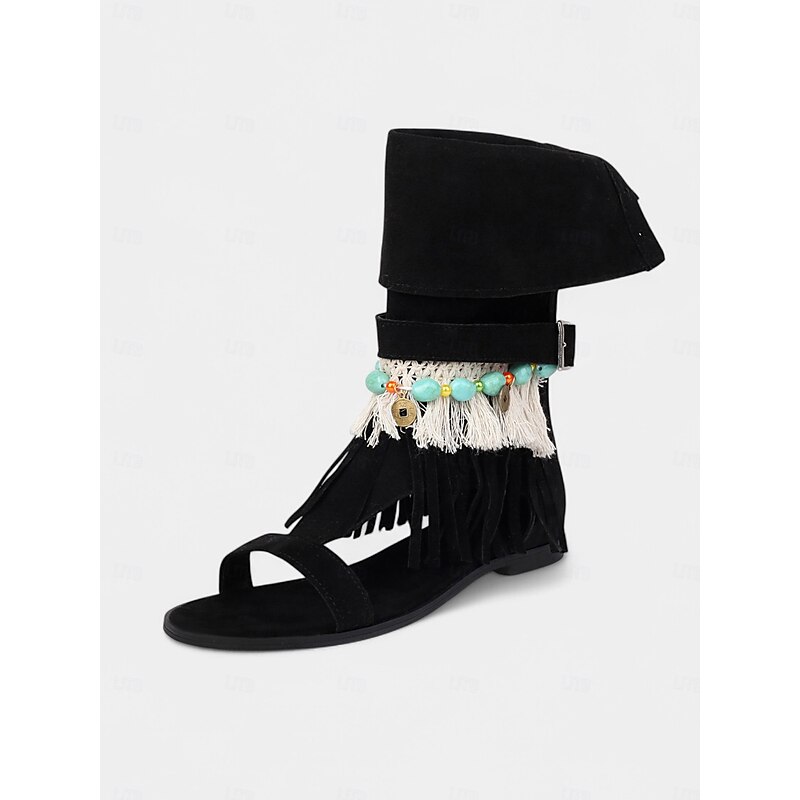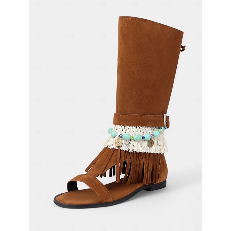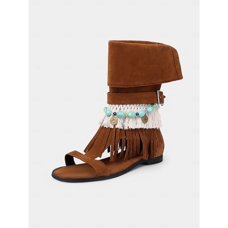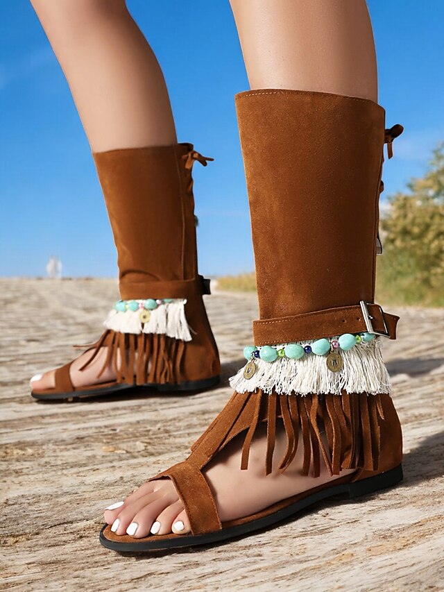 HOT ! Women's Boho Fringe Gladiator Sandals – Knee High Suede Summer Boots with Beaded Ankle Strap for Festival & Casual Wear