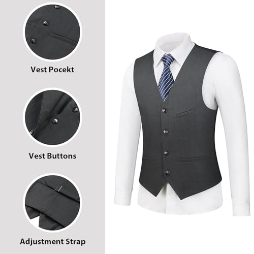 • 3 PIECE SET - The package contains a notched lapel one-button suit with 2 flap pockets, 1 breast pocket, and 2 inside pockets, a V adjustable vest with 4 buttons, and a pair of solid pants with same color as blazer.