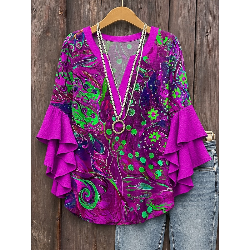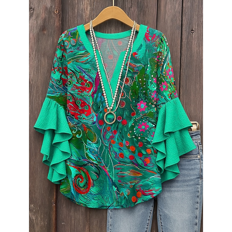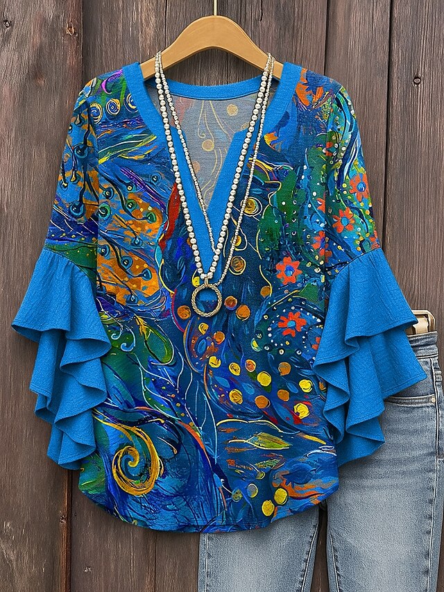 Women's Blouse V Neck Layered Ruffle Sleeve Tops Graphic Geometric Vintage Daily fashionable 3/4 Length Sleeve Regular Tops Daily Holiday Vacation Wear Print Red Blue Purple Green Summer Spring