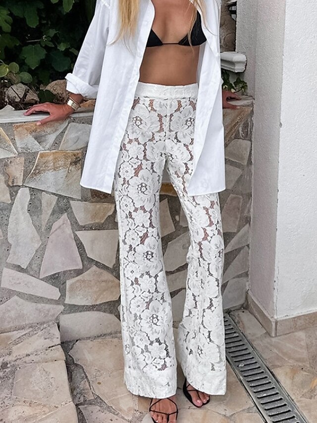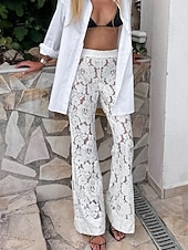 More information about Women's Wide Leg Bell Bottom Slacks Streetwear Casual Full Length Natural Plain Lace Elastic Waist Soft Holiday Daily Wear Weekend White Fall Regular Fit