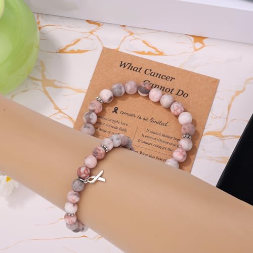 HOT ! Breast Awareness Bracelets, Natural Stone Inspirational Ribbon Beaded Bracelet with Motivational Card Care Encouragement Gift for Women Friends Family Loved Ones
