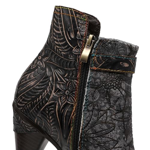 CrazycatZ Womens Leather Ankle Boots, Vintage Block Heels Floral Bohemian Bootie 7