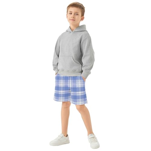 HOT ! Blue Plaid Athletic Shorts with Zipper Pockets, Youth Boys Athletic Running Shorts for Summer