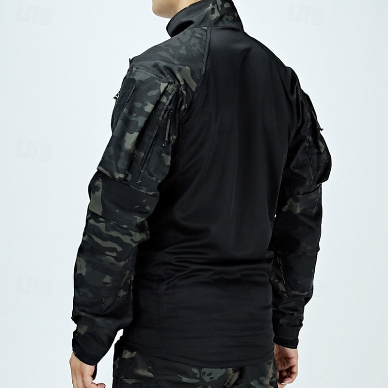 Men's Combat Shirt Hiking Shirt Tactical Military Shirt Long Sleeve Quarter Zip Top Outdoor Breathable Soft Polyester Patchwork Black Army Green Rough Black Gym Climbing Camping / Hiking / Caving 6