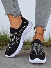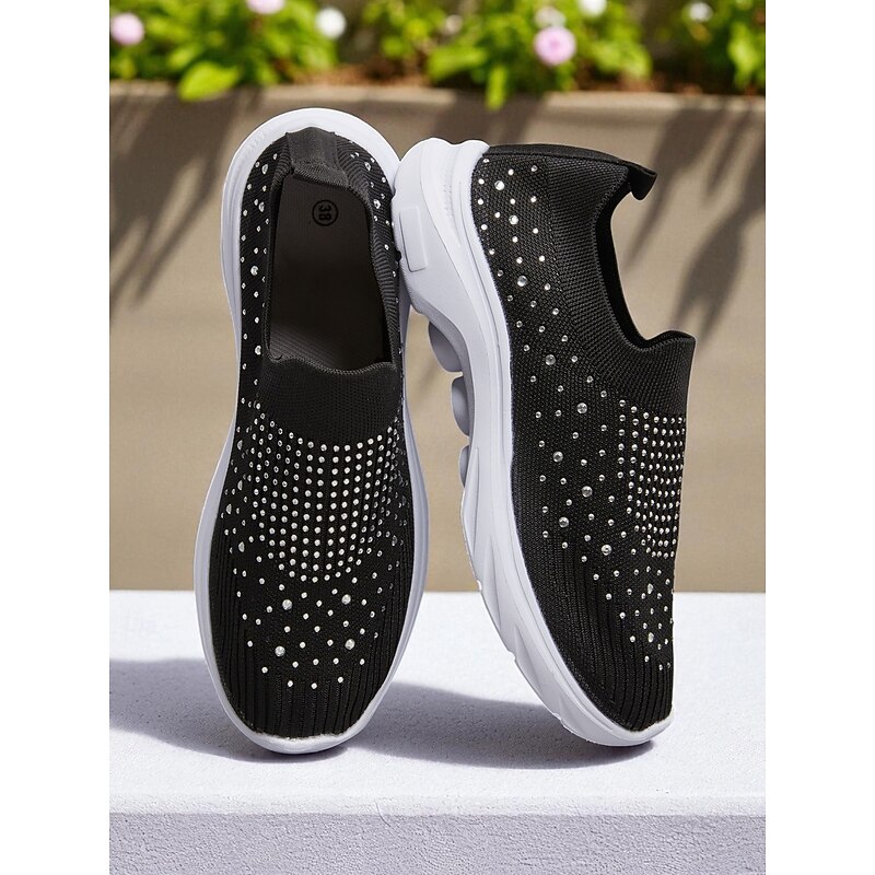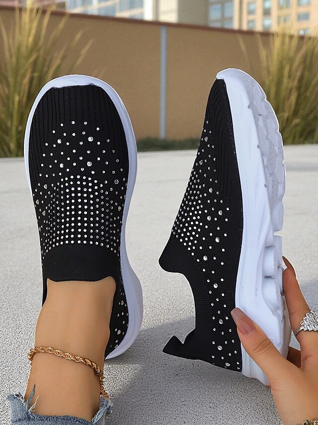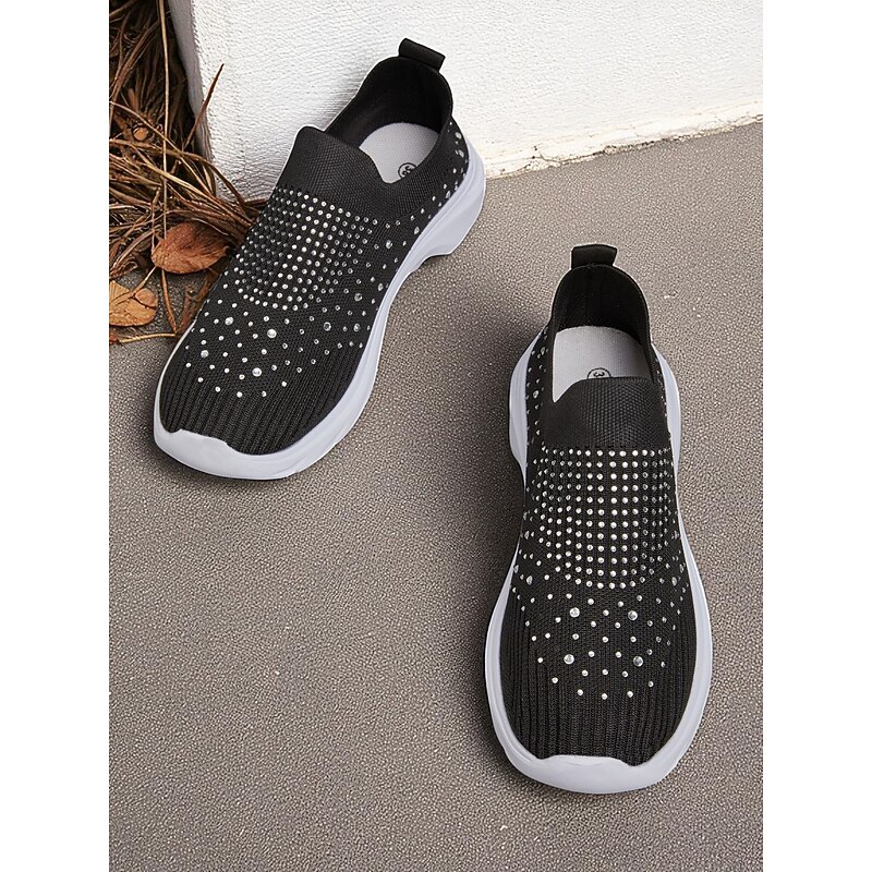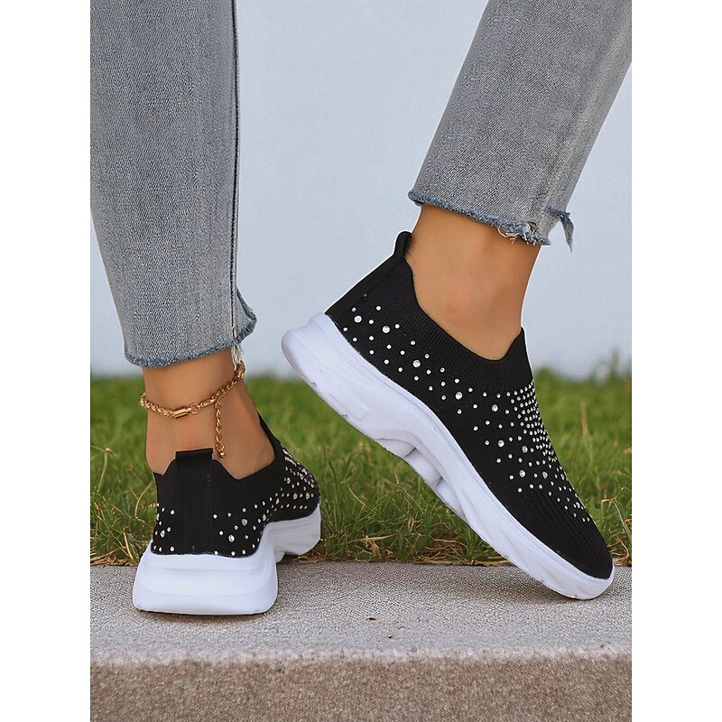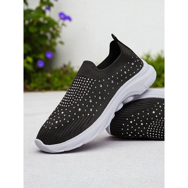 HOT ! Women's Black Slip On Flyknit Sneakers with Rhinestone Detailing – Lightweight Casual Walking Shoes for Everyday Wear