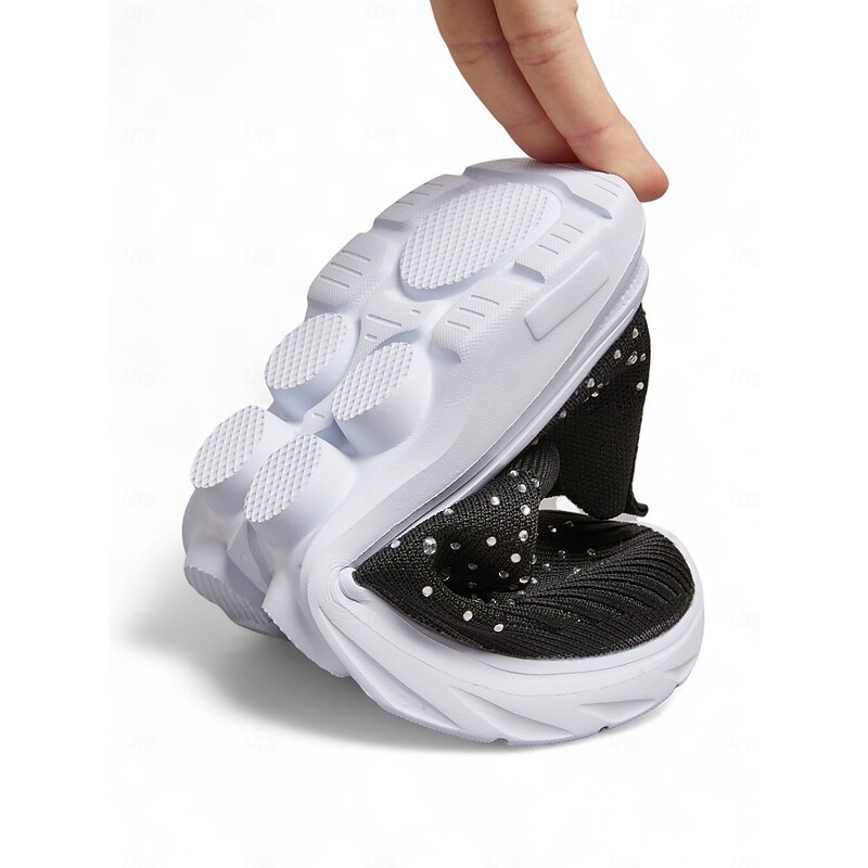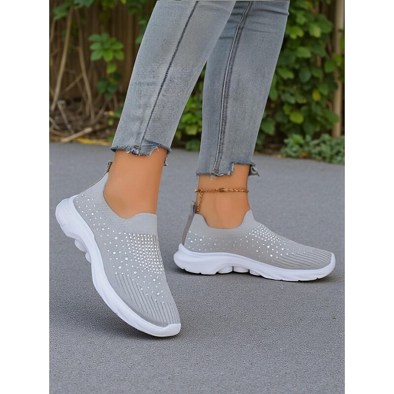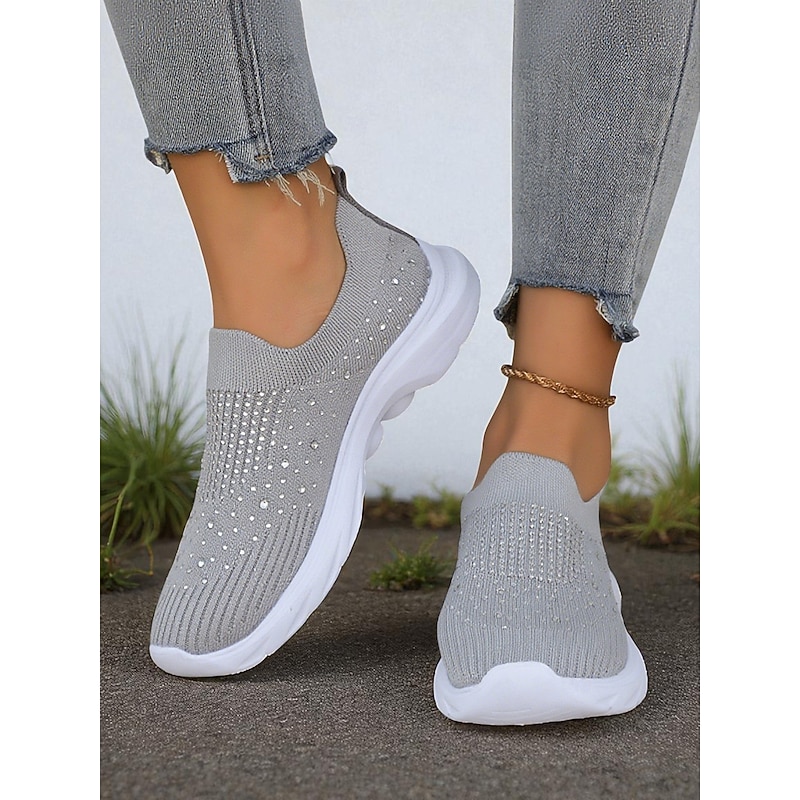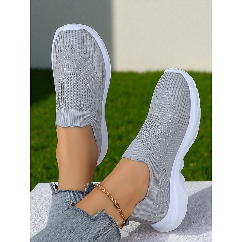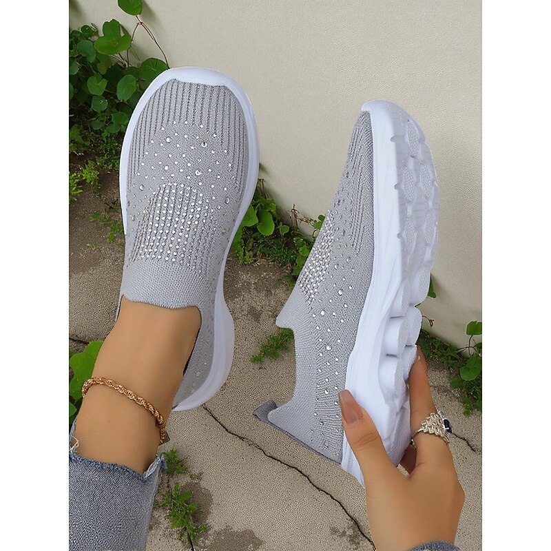 HOT ! Women's Black Slip On Flyknit Sneakers with Rhinestone Detailing – Lightweight Casual Walking Shoes for Everyday Wear