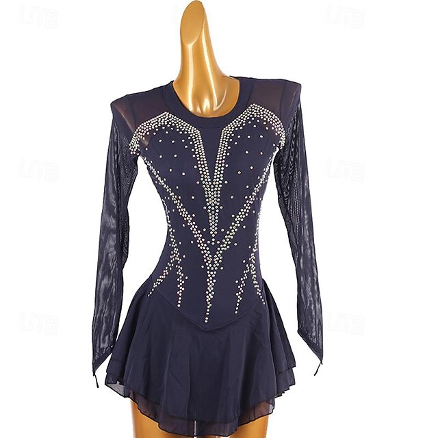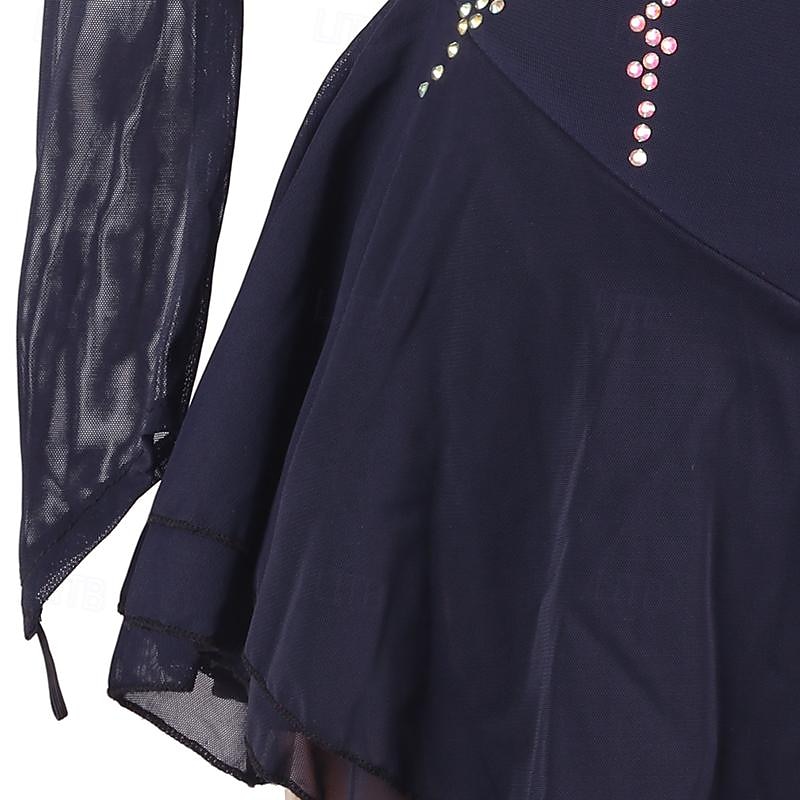 More information about Figure Skating Dress Women's Girls' Ice Skating Dress Dark Navy Patchwork Open Back Mesh High Elasticity Training Competition Skating Wear Classic Crystal / Rhinestone Long Sleeve Ice Skating Figure
