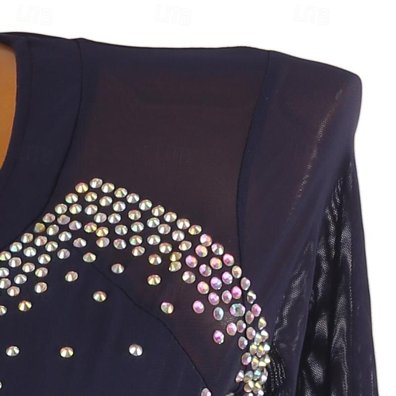 Figure Skating Dress Women's Girls' Ice Skating Dress Dark Navy Patchwork Open Back Mesh High Elasticity Training Competition Skating Wear Classic Crystal / Rhinestone Long Sleeve Ice Skating Figure 9