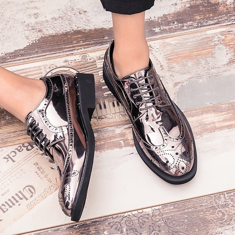 Men's Silver Metallic Oxford Brogue Shoes - Shiny Lace-Up Dress Shoes with Rugged Sole for Formal Events and Parties 6