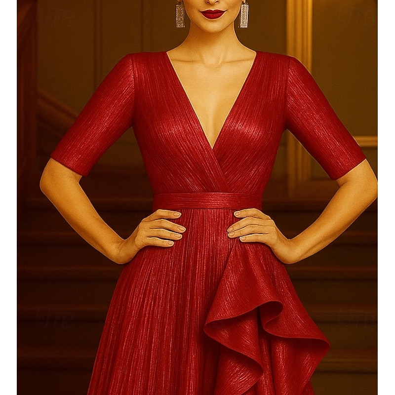 More information about Red Black A-Line Evening Gown Elegant Formal Dress Formal Wedding Floor Length Half Sleeve V Neck Champagne Mother Of the Bride Dress Lurex Fabric with Glitter Ruffles 2025