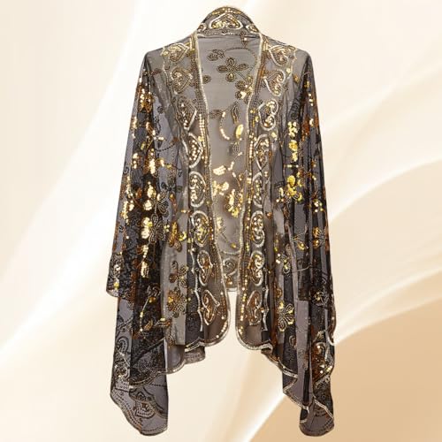 HOT ! Black Floral Lace Embroidered Shawl Wraps Gold Sparkly Beaded Sequin Scarf Cape Flower Leaf Vine Pattern Vintage 1920S Long Sheer Pashmina Shawls for Women Evening Dress Wedding Bridal Party