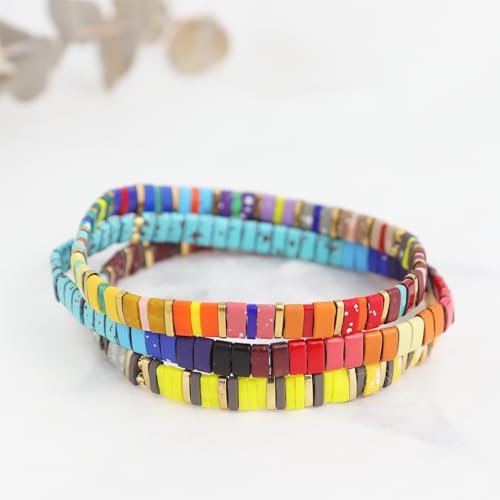 HOT ! Sonateomber Colorful Tila Flat Beads Stretch Bracelets for Women, Trendy Unique Handmade Stackable Blue Green Mixed Colorful Square Beaded Link Bracelet Summer Jewelry Gift
