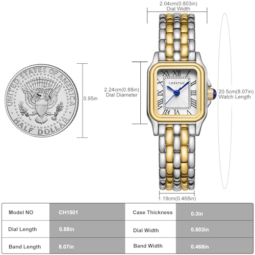 • SMALL TWO-TONE DESIGN: This square silver gold plated women watch designed by a smaller case size: case length: 0.79in, case width: 0.72in, boasts a sleek design highlighted by its elegant bracelet, perfectly complementing every outfits from casual to formal