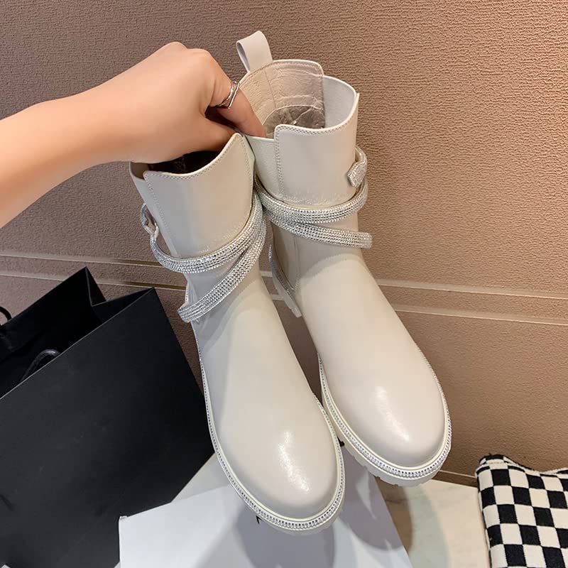 keleimusi Women's Crystal Embellished Ankle Wrap Chelsea Combat Booties with Flat Lugs 5