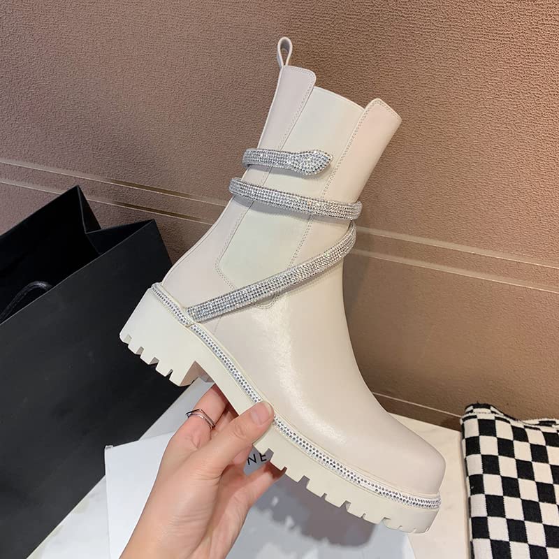 keleimusi Women's Crystal Embellished Ankle Wrap Chelsea Combat Booties with Flat Lugs 7
