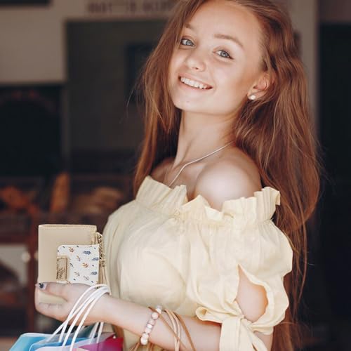 Cute Wallet for Women PU Leather Short Women Wallet with Tassel Pendant and Wheat Ear Pattern, Bifold Wallet with 5 Credit Card Slots, ID Window and Zippered Coin Pocket (Beige) 4