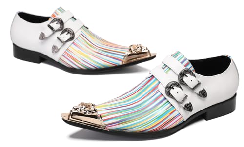 HOT ! Santimon Mens Loafers Party Dress Casual Metal-Tip Toe Double Buckle Slip On Leather Rainbow Loafers Western Fashio Tuxedo Prom Summer Shoes for Men Boys