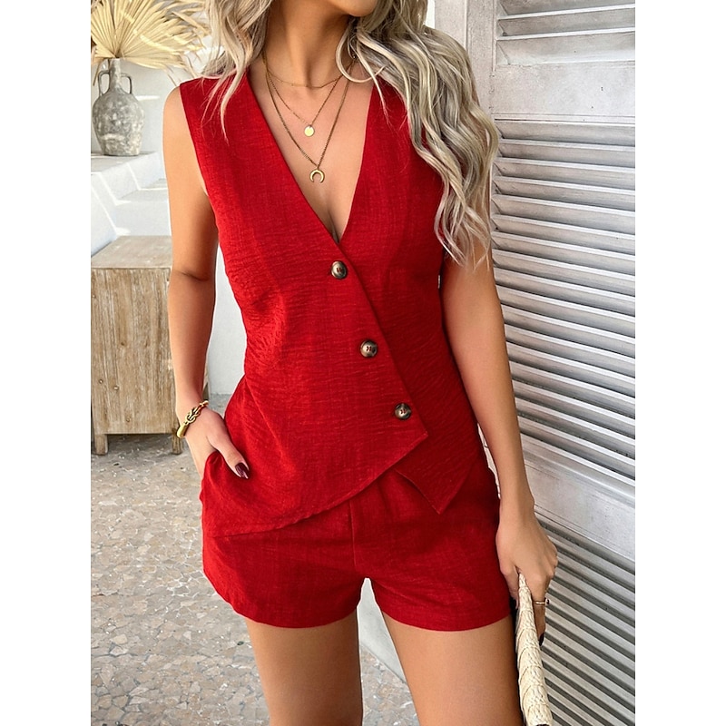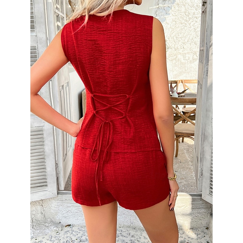 Women's Active Basic Linen-Inspired Sets Two Piece Sets Vest Sleeveless V Neck Solid Color Casual Daily Black Red Green Summer Regular Fit 15