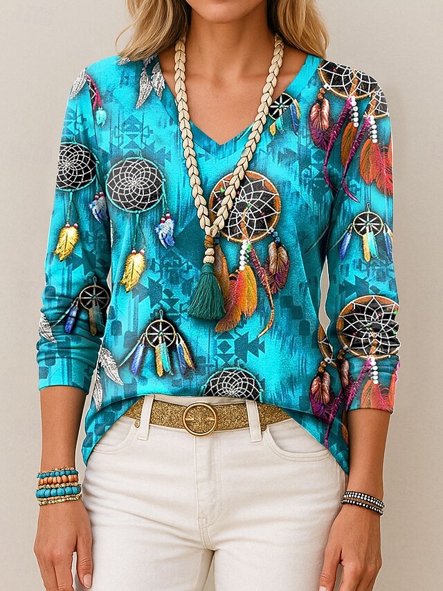 Women's T Shirt V Neck Long Sleeve Tunic Graphic Feather Vintage Stylish Casual Regular Tops Daily Print Blue Purple Orange Green Summer Spring Fall 10