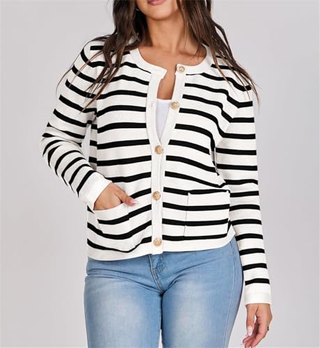 More information about Women Striped Cardigan Sweaters Knitted Gold Buttons Crew Neck Sweater with Pocket Cropped Knit Lady Casual Jackets Coat