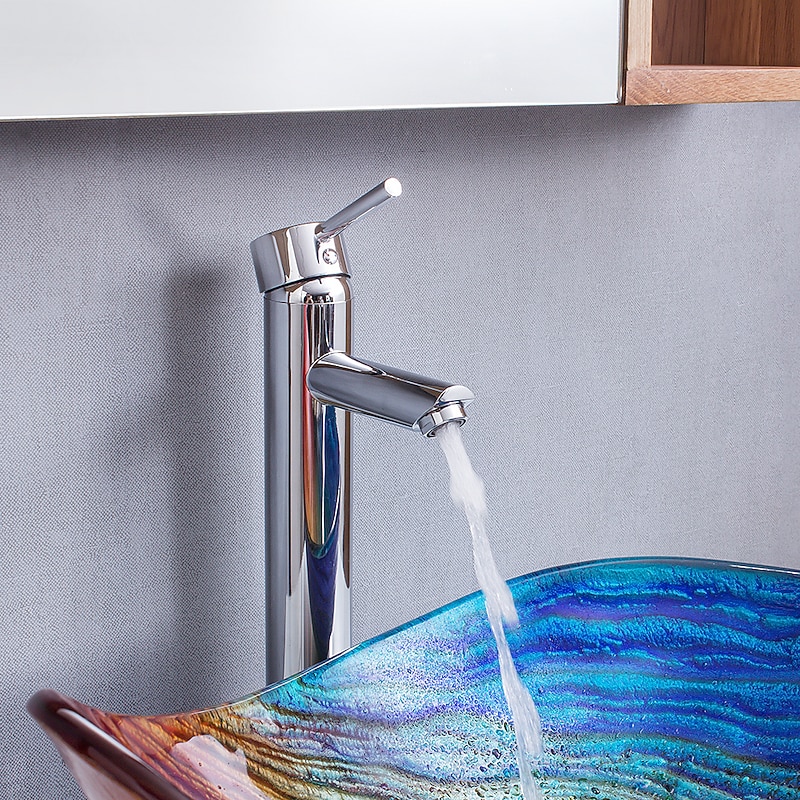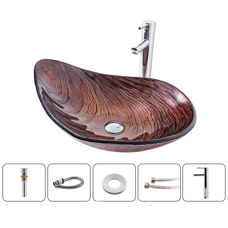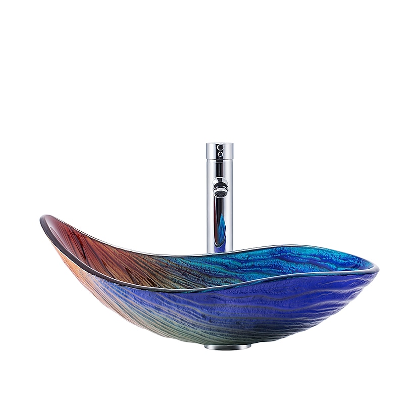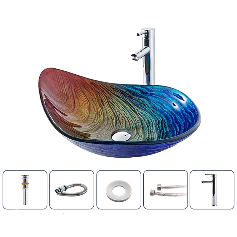 Highlights Outstanding Value : Slick touch texture Gives Comfortable Sensation; Artificial hand-painted Pattern let the beauty of your new bathroom vanity shine through, Glossy surface is easy to clean up. Tempered Glass Material : Tempered glass sink with solid brass faucet for durability and reliability. The ship form is classical, aesthetic, and easy to clean up. Sink Dimension : 21.7" Length x 14.9' Width x 6.7" Height. Appropriate size design so you don't have to worry about water splashing,Designed for above counter, Installation with standard US plumbing connections(1/2-inch). Easy to Install : The faucet with complete accessories complements the basin, drill a suitable hole on the countertop for draining to install. Package included : Vessel Sink + faucet + Pop-up Drain and Mounting Ring all included,if you had install problem can contact us. Note: Dear buyer, if the parcel is found to be badly damaged, please take a photo, reject it and contact us for resolution. Because of the size measurements are handmade, so there may be 1-3CM error. Please understand because of the light irradiation or computer display difference, so I can't guarantee photos and real color is 100% the same.