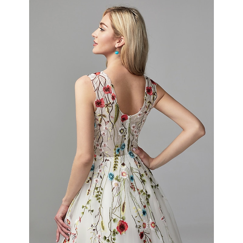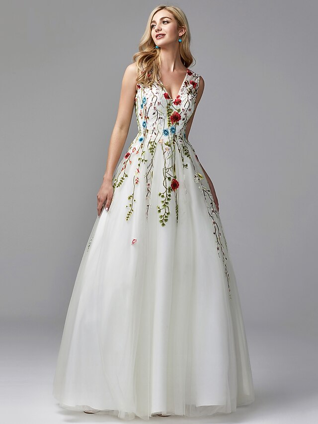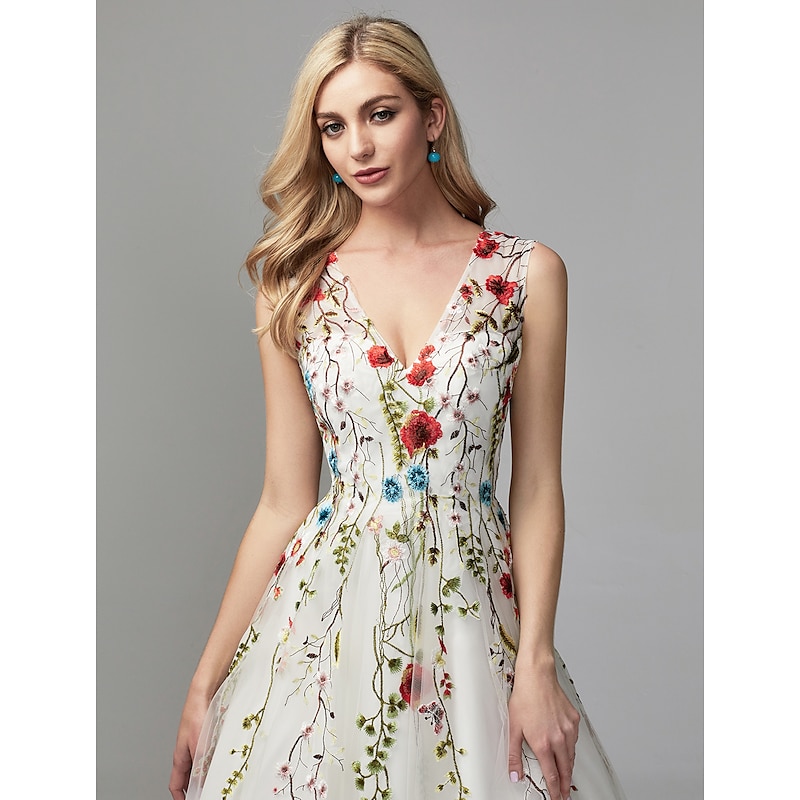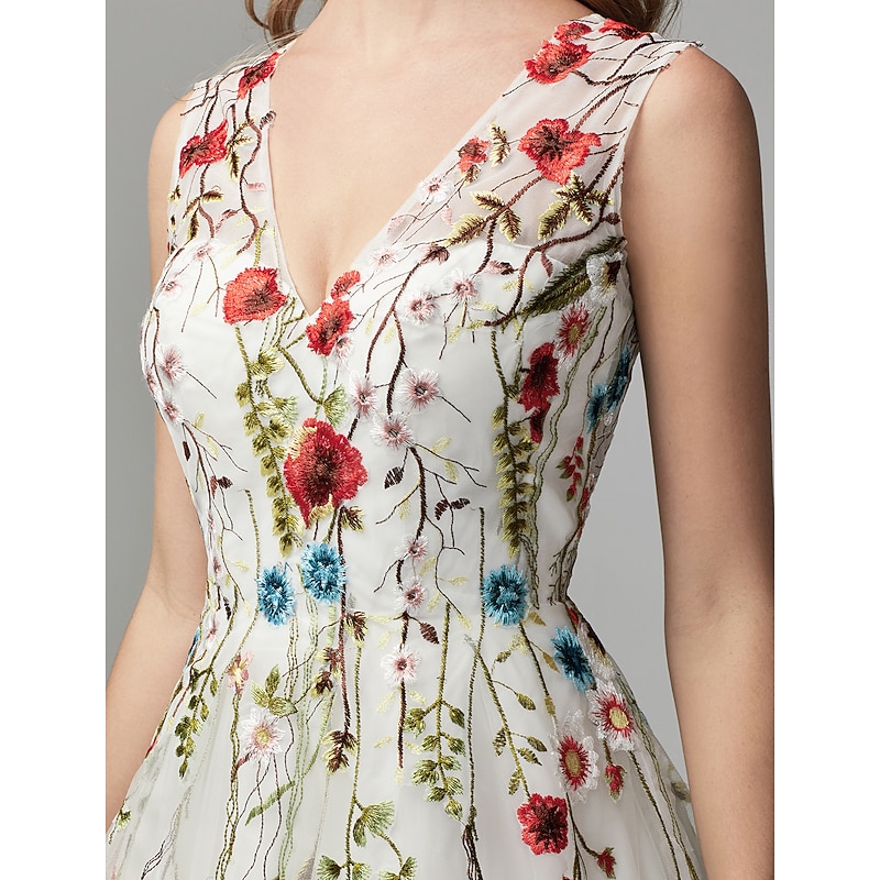 HOT ! Beach Wedding A-Line Special Occasion Dresses Floral Dress Valentine's Day Wedding Guest Floor Length Sleeveless V Neck Lace with Embroidery Appliques dress to impress