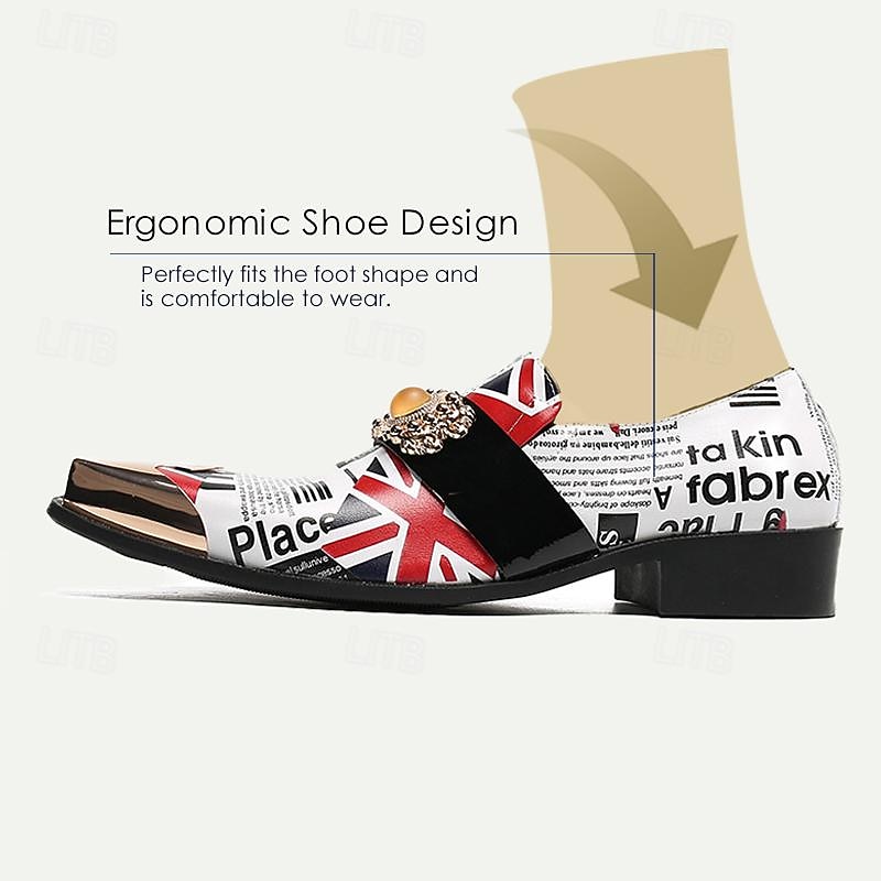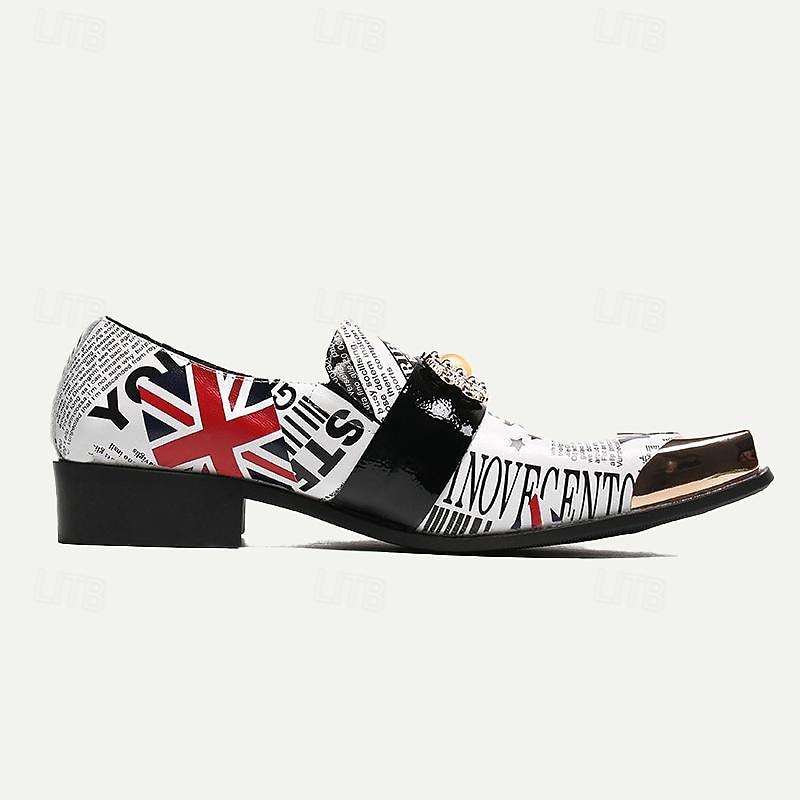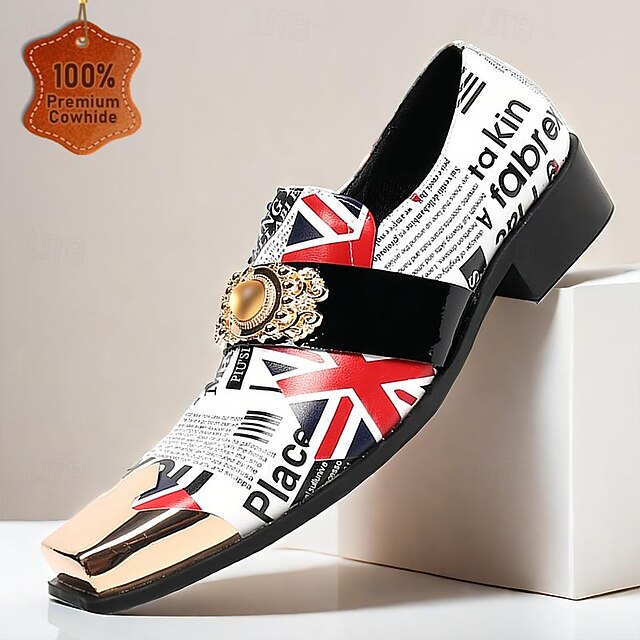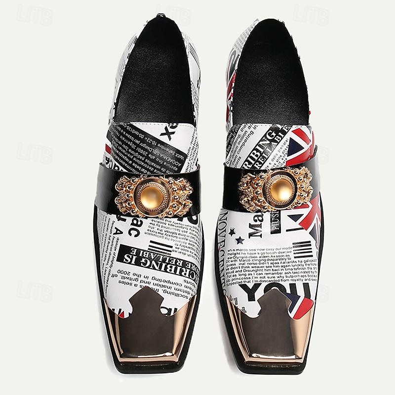 Highlights [Fabric] : Crafted from 100% premium Italian full-grain cowhide leather, these loafers promise durability and a luxurious feel. The lining is also leather, ensuring comfort with every step. [Style] : These men's loafers feature a sleek square toe and a robust low block heel, offering a refined look while maintaining comfort and stability. The leather upper creates a sophisticated silhouette and is designed for those who appreciate modern yet timeless footwear. [Design Highlights] : The loafers are adorned with a bold artistic collage that combines embossed patterns and color block designs, prominently featuring Union Jack and newspaper print motifs. A metallic gold cap on the pointed toe amplifies their luxury, while a glossy black patent leather band across the instep includes an elegant gold-tone decorative buckle. [Occasions] : Ideal for both formal events and casual gatherings, these shoes add a unique twist to any outfit, making them a versatile addition to your wardrobe. Whether it is a gala dinner, a casual night out, or a stylish workday, these loafers stand out with their artistic flair and sophisticated elements. [Size Range] : Available in sizes ranging from US6 to US13, these loafers offer a broad range of fitting options, ensuring the perfect fit for every gentleman.