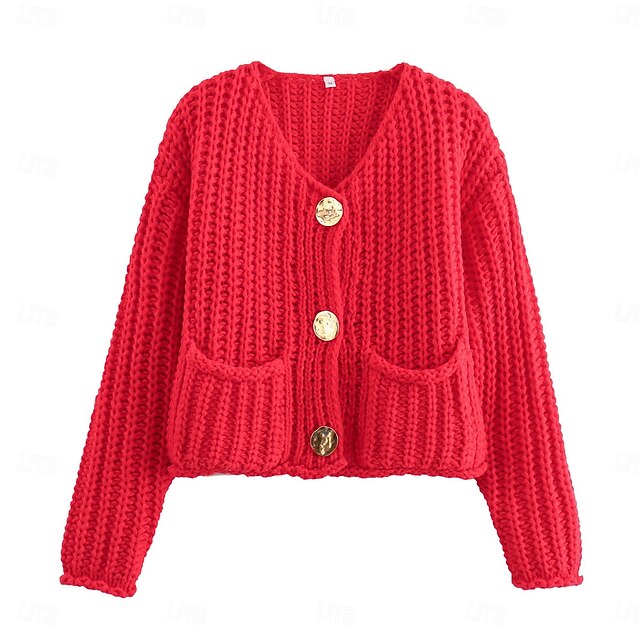 Highlights [Fabric] : Crafted from a chunky knit, this women's cardigan offers a cozy and comfortable feel, ideal for the cooler months of fall and winter. The fabric's micro-elasticity ensures a snug yet flexible fit, making it perfect for everyday wear. [Fit] : Featuring a regular fit and a cropped length, this cardigan is designed with a relaxed silhouette that allows it to be easily layered over any outfit. The crew neckline adds a classic touch, perfect for casual and polished looks alike. [Design Highlights] : This vibrant red cardigan is accented with three large gold buttons that enhance its sophistication and charm. The inclusion of two functional front pockets adds practicality while maintaining a modern, stylish vibe. [Occasions] : Suitable for a variety of occasions, this cardigan can be worn for work, casual outings, or as a part of your daily streetwear ensemble. It effortlessly blends with different styles, adding warmth and style to your fall and winter wardrobe. [Size Range] : Available in sizes S, M, and L, this cardigan is designed to fit a range of body types comfortably. Its versatile style makes it a staple piece for any wardrobe.
