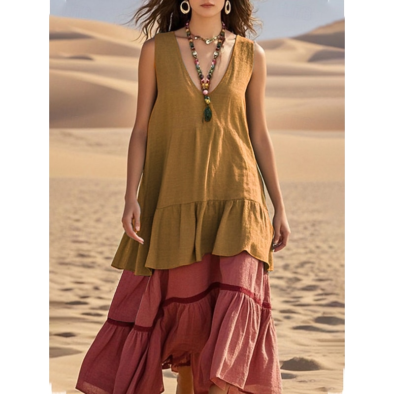 HOT ! Women's Midi Dress Linen-Inspired Dresses Cotton Linen Dress Fashion Vacation Holiday Slim Color Block Sleeveless V Neck caramel Royal Blue Purple Green Summer