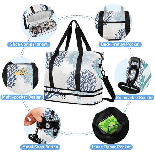 Blue Coral Sea Beach Gym Bag for Women Sport Travel Duffel Bag Shoulder Weekender Overnight Bags with Wet Pocket & Shoe Compartment 5